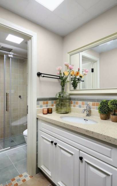 所以,为了让洗漱台的功能得以全面发挥,很多样板间都选择把洗漱台单独分隔出来,这样一来,不但提高了卫生间的使用效率,而且也做到了干湿分离。