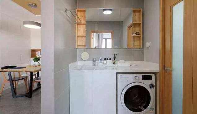 如果卫生间面积不够用,不妨向洗漱台的下方位置借“空间”,将滚筒洗衣机做好内嵌式设计,视觉上也非常和谐,而且还能为阳台和厨房节省空间呢!