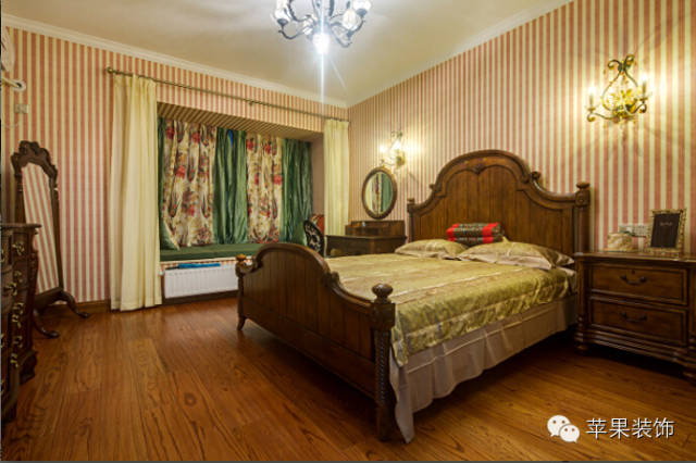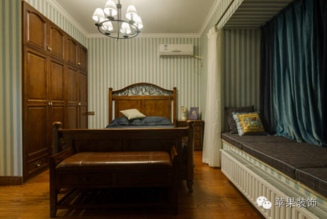 美式家居的卧室布置较为温馨,作为主人的私密空间,主要以功能性和实用舒适为考虑的重点,一般的卧室不设顶灯,多用温馨柔软的成套布艺来装点,同时在软装和用色上非常统一。