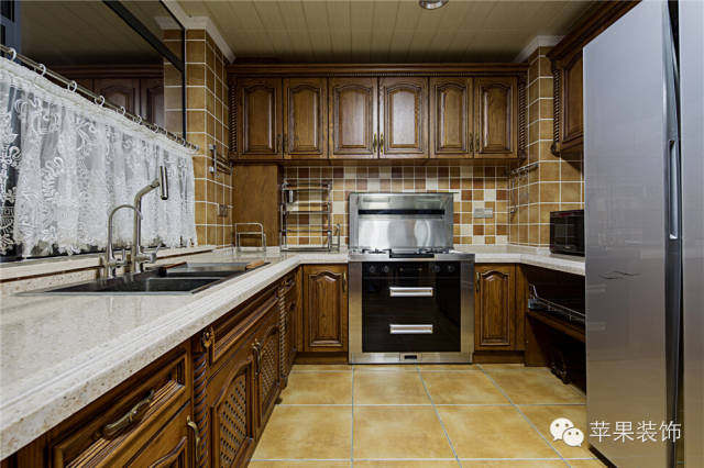 厨房在美国人眼中一般是开敞的(由于其饮食烹饪习惯),同时需要有一个便餐台在厨房的一隅,还要具备功能强大又简单耐用的厨具设备,如水槽下的残渣粉碎机,烤箱等。需要有容纳双开门冰箱的宽敞位置和足够的操作台面。在装饰上也有很多讲究,如喜好仿古面的墙砖、橱具门板喜好用实木门扇或是白色模压门扇仿木纹色。另外,厨房的窗也喜欢配置窗帘等。