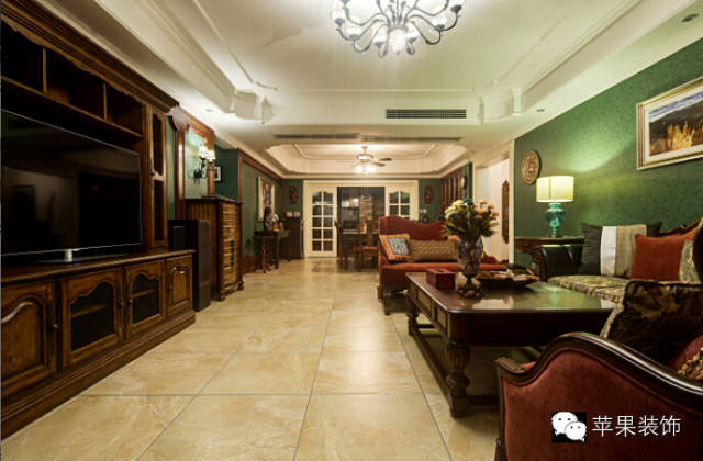 客厅作为待客区域,一般要求简洁明快,同时装修较其它空间要更明快光鲜,通常使用大量的石材和木饰面装饰;美国人喜欢有历史感的东西,这不仅反映在软装摆件上对仿古艺术品的喜爱,同时也反映在装修上对各种仿古墙地砖、石材的偏爱和对各种仿旧工艺的追求上。总体而言,美式田园风格的客厅是宽敞而富有历史气息的。