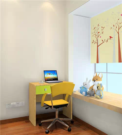 书桌学习区靠窗打造,之所以设计得小小的,是因为还要给孩子留出玩耍的空间。
