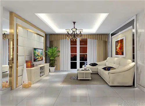 所有家具的造型都追求极简主义,还原出简欧风的大气优雅。金色边框点缀的电视墙、吊灯、复古壁画为空间增添不张扬的奢华感。
