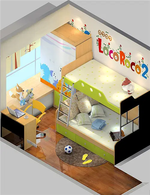 原木色搭配草绿色,再辅以别的色彩点缀,打造出一个充满自然气息的儿童房。