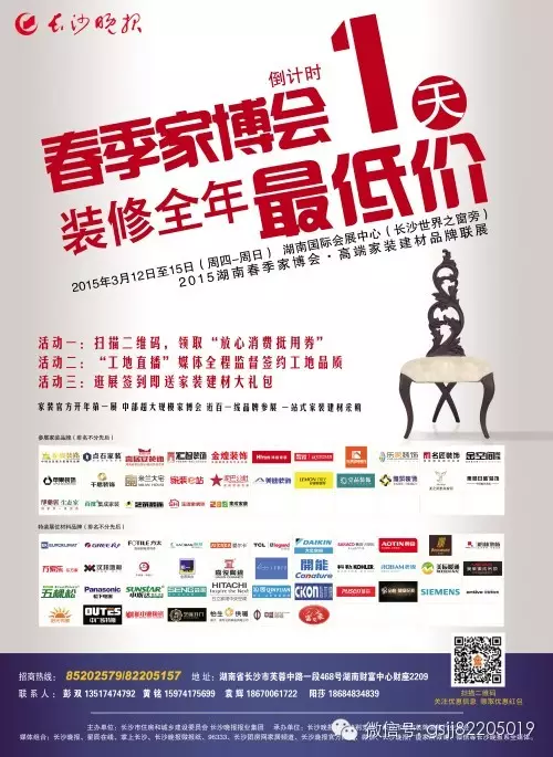 从周四到周日,此次春季家博会将在星城长沙掀起一场家装、建材、家电行业的让利风暴。长沙市民不仅可以一站搞定家装全流程,还能享受到全年最集中、最给力的优惠活动,欣赏一场引领2015家居时尚潮流的“生态家居大秀”。