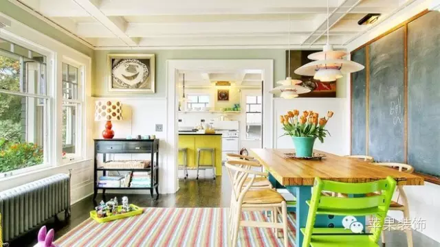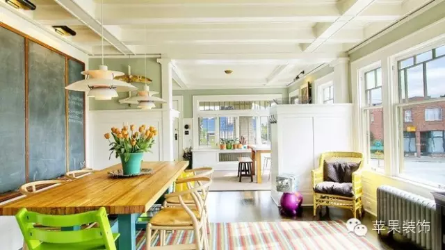 设计TIPS:裸露的吊顶与门框、窗框及墙裙采用相同材质的木材并涂上白色油漆,与涂上果绿色的墙面搭配,清爽又不失温馨。