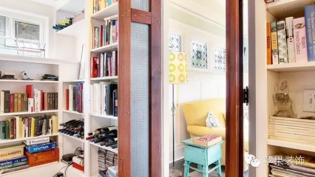 设计TIPS:入墙式书架的风格和设计沿袭客厅的风格,利用白色板材搭建成大小不小的格子,方便存放不同尺寸的书籍和杂物。