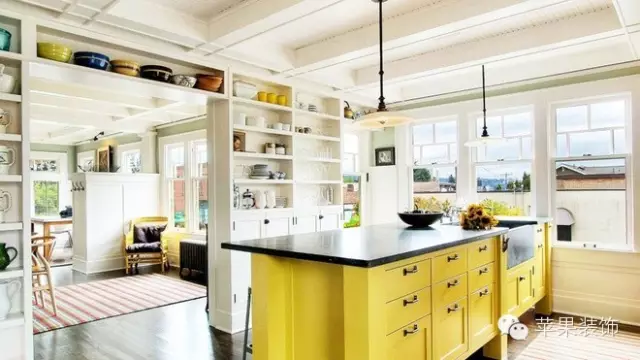 设计TIPS:大理石的操作台桌面古朴又耐用,柠檬黄的实木柜体对纯白的橱柜灶台遥相呼应,清新的田园风扑面而来。