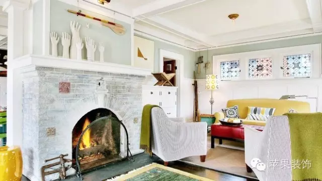 设计TIPS:石材砌成的壁炉集实用与美观于一体,舒适的布艺沙发和色彩鲜艳的靠垫,无不让人想赖在这里享受家的惬意与温暖。