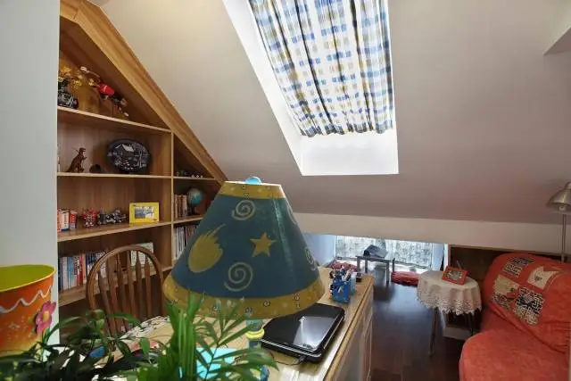 阁楼上的书房,木质的书架,西瓜红的沙发,蓝黄色的台灯,还有一抬头就可见的天窗。白天阳光作伴,夜晚星星相陪。