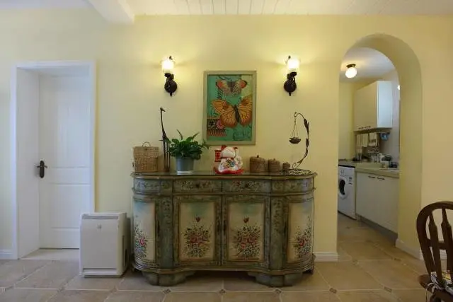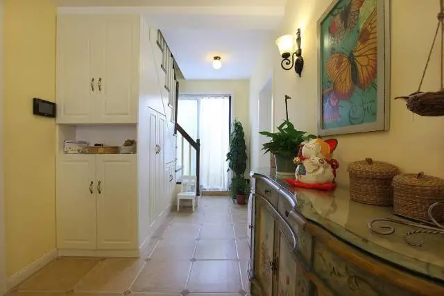 进门便是通往阁楼的楼梯,将背面改成了鞋柜,中间留白,摆放钥匙等物件。进门便可见到摆放的欧式复古置物台,花纹、色泽都很柔软,招财猫是老公的最爱。台子左边是卫生间,右边是厨房。