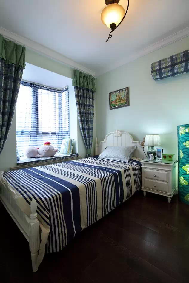 他特别喜欢蓝色和条纹,所以给他的房间用了蓝色调,配上了蓝色横条纹窗帘和床单,家具选择了白色调,蓝白搭配比较清爽干净。