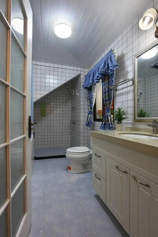 与楼下卫生间的实用主义相比,阁楼上的卫生间简直是仙女了。整面的白色马赛克状墙砖,灰色填缝剂,搭配蓝色窗帘,清新值爆表!鉴于尖顶阁楼,所以比较矮,洗澡的时候,要当心头。