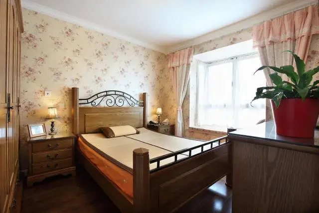 墙纸是田园碎花的,很有英国情调,家具却是中式复古的,有点老家具的味道。不过整体觉得很和谐~