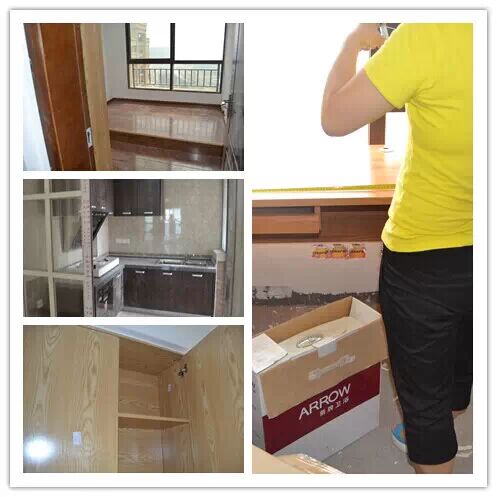 材料部主管仔细查看各工地的衣柜、橱柜、成品书桌等,发现到问题立即在现场与客户、设计师及材料商进行电话联系,力求尽早解决。