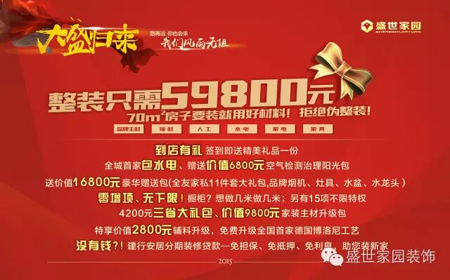 主题:盛世家园年中大促感恩回馈活动 主标题:大盛归来 副标题:路再远,你也会来,我们风雨无阻 时间:2015.7.25下午14:00—18:00 地点:瑞城名人酒店 主办单位:四川省盛世家园装饰工程有限公司 咨询热线:028-81726318