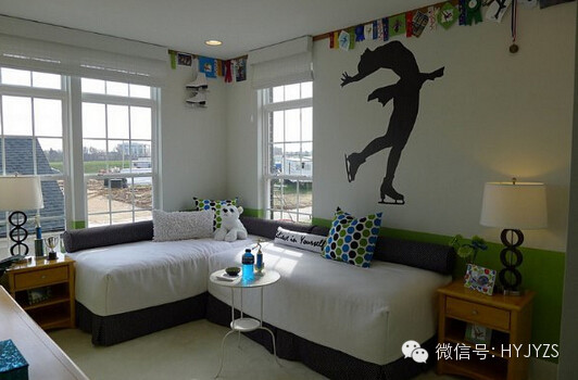 两张床挨在角落里,减少了空间的浪费,两张床之间的公共区域,可用于壁灯照明,或作为存储和展示空间。