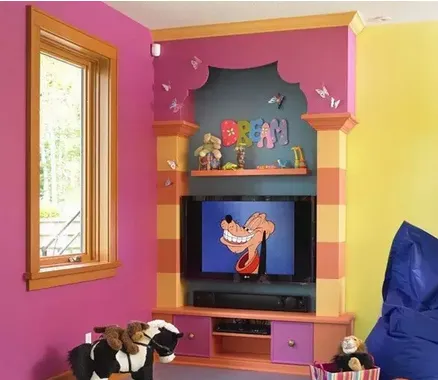 儿童房的电视背景墙,丰富的色彩搭配,靓丽的粉色、温暖的橘色和黄色组成好似宫殿的入口,蝴蝶在飞舞,仿佛进入童话世界。哪个女孩儿心中没有个公主梦呢!